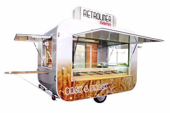 Die 3-Klappen Pavillonoptik mit gerundeten Ecken machen den RETROLINER Grillwagen zu einer einizigartigen mobilen Verkaufs- und Promotionlösung. Hergestellt wird der RETROLINER ausschließlich in Deutschland – „Made in Germany“ – seit 1975. Langjährige Fahrzeugbauerfahrung und tausende zufriedene Kunden beweisen Solidität, Funktionalität und Langlebigkeit der mobilen Verkaufslösungen von GAMO.