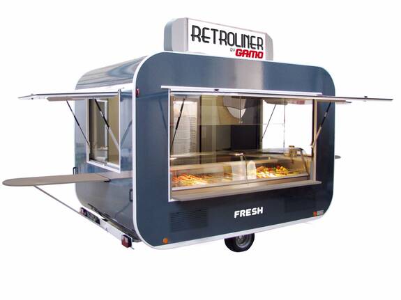 Optisch attraktiver und funktioneller Kühlthekenanhänger in RETRO-Optik. Die 3-Klappen Pavillonoptik mit gerundeten Ecken machen den RETROLINER zum echten Hingucker. Der RETROLINER wird ausschließlich in Deutschland gebaut.